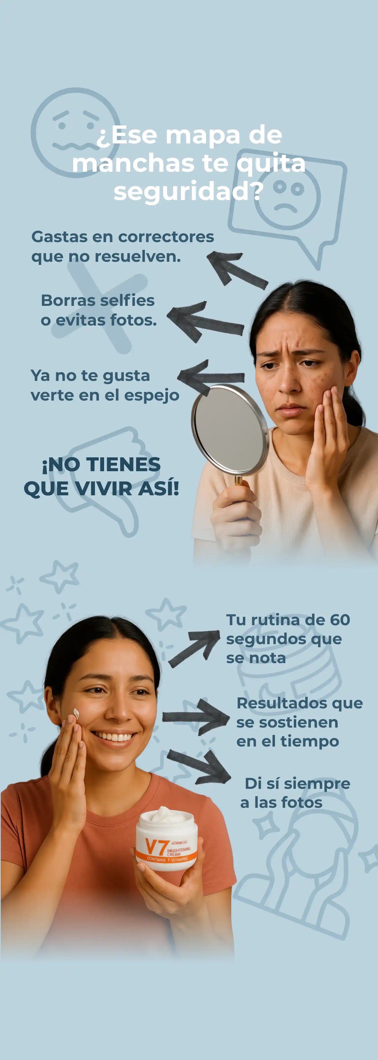 Por la noche: piel limpia → V7 (tamaño arveja, evita contorno de ojos). Por el día: tu protector solar para mantener el progreso. Textura ligera, no grasa.